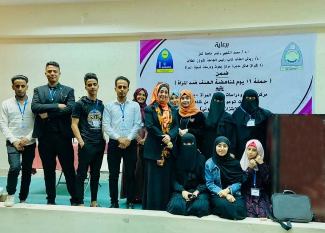 واصل مركز دراسات وبحوث تنمية المرأة بجامعة تعز، فعاليات الوعي للحد من ظاهرة الابتزاز الإلكتروني، ضمن حملة 16 يوم لمناهضة العنف ضد المرأة