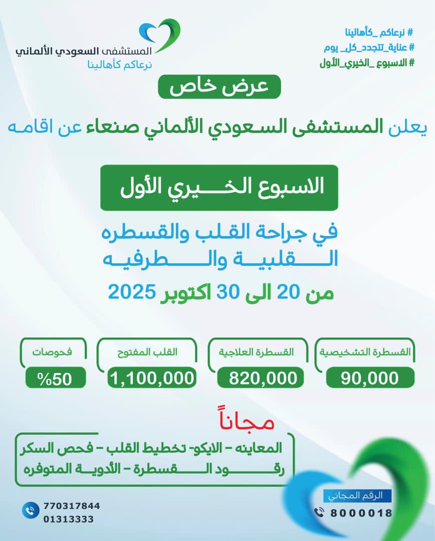 وأشار إلى أن الهدف من هذه المبادرة هو التخفيف من معاناة المرضى، خصوصًا في ظل الظروف الصعبة التي تمر بها البلاد، وانطلاقًا من الدور الإنساني والطبي الذي يضطلع به المستشفى السعودي الألماني تجاه أبناء الشعب اليمني.