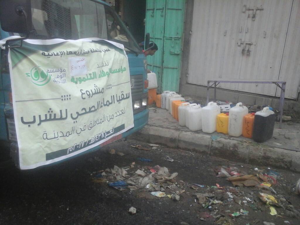 تستمر مؤسسة الوفاء التنمويه مشروع سقيا الماء الصحي الصالح للشرب في محافظة تعز حتى يومنا هذا الخميس 29/6/2017 م منذ اسبوعيين تزامنا اوخر الشهر الكريم وايام عيد الفطر المبارك وتعزيزا لقيم التكافل الاجتماعي بين ابناء المدينه ،حيث تم استهداف منطقة الروضه حي المستشفى ومنطقه وادي الدحي كونها المناطق الاكثر كثافة سكانيه واحتياجا لتلبيه رغبات الساكنين من متطلبات المياه الصالحة للشرب ..