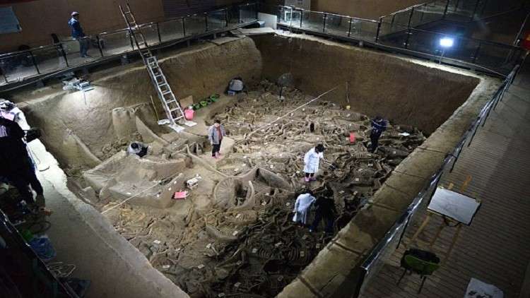 ووجد علماء الآثار هذا الاكتشاف بالقرب من مدينة شينتشنغ بمقاطعة خنان بوسط الصين، وقد تم العثور على أربع عربات وهياكل عظمية لأكثر من 90 حصانا داخل الحفرة منذ فبراير الماضي.