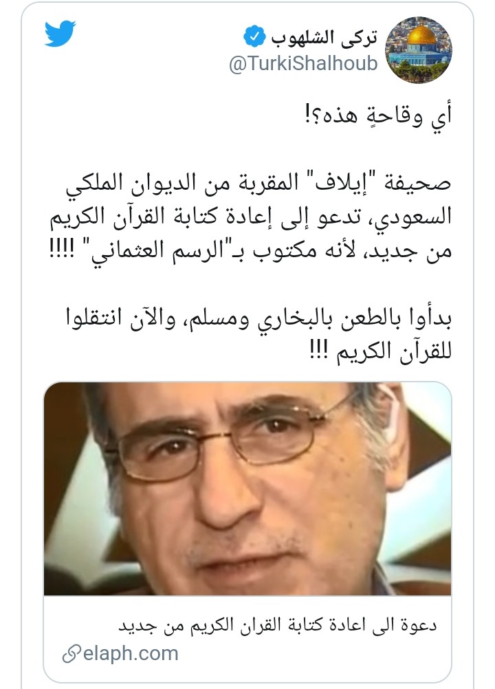 طالبت صحيفة "إيلاف" السعودية بإعادة كتابة القرآن الكريم من جديد وإعادة النظر في الأصول الشرعية والفقهية بالإسلام، ما أثار موجة غضب واسعة على مواقع التواصل الإجتماعيّ